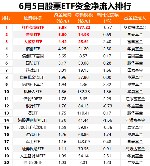 具体产品方面,6月5日,创业板ETF资金净流出4.3亿元,科创50ETF净流出4.05亿元,沪深300ETF净流出3.83亿元。
