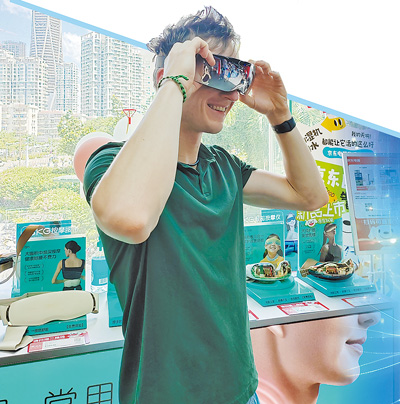 在深圳福田区华强北群星广场购物中心,来自德国的小伙子凯试戴电子眼部按摩仪。人民日报记者 洪秋婷摄